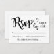 Les cartes RSVP de mariage modernes disposent d'un schéma moderne de couleurs noir et blanc avec une typographie de script de calligraphie écrite à la main et audacieuse avec des détails de défilement élégants. Inclut une ligne pour le nombre total de clients présents. Personnalisez le texte personnalisé décontracté mais élégant avec votre date d'échéance de réponse.