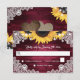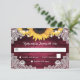 Cartes RSVP personnalisées de mariage bordeaux et rustiques avec tournesols sur un arrière - plan en bois de grange orné de dentelle blanche fleurie et de lampes à cordes. Deux coeurs de burlap à l'arrière. Un design de carte parfait pour compléter votre mariage rustique bordeaux inspiré des tournesols. Éléments correspondants disponibles pour cette carte RSVP entièrement personnalisable.
