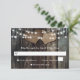 Carte RSVP mariage campagnard rustique avec des coeurs de burlap et des lampes à cordes contre un arrière - plan en bois de grange.