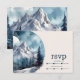 La carte de réponse de mariage hivernal Rustic Watercolor Mountain Forest est un ajout charmant et pratique à votre suite d'invitation de mariage, permettant à vos invités de répondre facilement à votre célébration de mariage hivernal. Avec son charme rustique et son design captivant, cette carte de réponse complète le thème et l'esthétique globale de votre journée spéciale. Le centre de la carte de réponse présente une belle peinture à l'aquarelle qui capture l'atmosphère sereine et enchanteresse d'une forêt de montagne pendant la saison hivernale.La palette de couleurs de bleus frais, de blancs neigeux et de verts terreux s'harmonise parfaitement avec le thème hivernal, créant un design visuellement attrayant et cohérent.