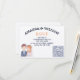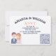 La carte RSVP de mariage présente une charmante illustration d'une mariée et d'un marié. Le marié est représenté avec des cheveux bruns courts, un teint clair, et porte une veste de costume bleu marine sur une chemise bleu clair et une cravate blanche. Il a une petite boutonnière épinglée sur son revers. La mariée se tient à côté de lui, souriant doucement. Elle a des cheveux ondulés, rougeâtre-oranges, ornés d'une couronne de fleurs rose, orange et blanche. Un délicat voile blanc coule derrière elle. Elle porte une robe mariage blanche avec un collier d'amoureux et un collier de perles. Cette illustration simple, en forme de dessin animé, suggère un lien amoureux des cordes entre eux. C'est fantaisiste et attachant, donnant un ton joyeux au prochain mariage. Le texte est gardé le moins possible pour un sentiment général simple où l'amour est le seul élément important ! Tous les champs sont entièrement personnalisables.
