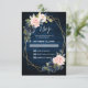 Carte de réponse de mariage géométrique florale bleu marine foncé avec un élégant bouquet de bleu marine, bleu roi, blanc, rose carmin et feuilles d'eucalyptus vert sauge et un cadre géométrique neutre avec paillettes élégantes. N'hésitez pas à me contacter pour toute aide de personnalisation ou si vous avez besoin d'un autre produit avec ce design.