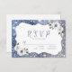 Cadre brillant argent et bleu parties scintillant et scénario "RSVP" avec floral bleu et blanc poussiéreux, élégant et élégant. Idéal pour un mariage moderne, un mariage romantique et un mariage de jardin botanique. Voir toutes les pièces correspondantes dans la collection ci-dessous.