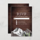 Elégante carte RSVP de mariage rustique avec de belles montagnes enneigées et des pins avec typographie moderne contre un arrière - plan de grange.