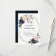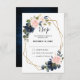Carte de réponse de mariage géométrique florale bleu marine foncé avec un élégant bouquet de bleu marine, bleu royal, blanc, rose poudré et feuilles d'eucalyptus vert sauge et un cadre géométrique neutre à paillettes élégant. N'hésitez pas à me contacter pour toute aide de personnalisation ou si vous avez besoin d'un autre produit avec ce design.