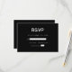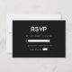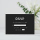 Cette superbe carte RSVP Black Modern Elegant Minimal Wedding est un choix parfait pour les couples à la recherche d'une façon branchée et élégante d'invitation leurs invités. Ce design minimaliste est doté d'un luxueux arrière - plan noir, parfaitement complété par une belle typographie moderne. Conçu dans un souci de simplicité, cette carte de réponse dégage un charme intemporel et un look raffiné qui améliore sans effort la sophistication de votre papeterie mariage. Customisez la couleur arrière - plan, la police de texte, la taille et le placement à votre goût à l'aide de l'outil de conception. Pour les articles correspondants, veuillez consulter la collection d'invitations Black Elegant Minimal Modern Dark Wedding.