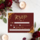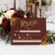 Rendez la réponse à votre invitation de mariage sans effort avec cette carte de réponse RSVP géométrique élégante de couleur bordeaux et or. Conçue avec un fond rouge foncé et des accents dorés luxueux, cette carte complète parfaitement un mariage élégant ou sur le thème de l'automne. Les invités peuvent facilement confirmer leur présence tout en ajoutant une touche de classe à votre papeterie de mariage. Personnalisez-la avec vos coordonnées RSVP préférées pour garantir un processus de réponse sans heurts.