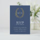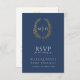 Mariage d'art botanique RSVP en feuille ovale bleu marine foncé et doré, à la main. Un design simple autour de vos initiales monographiques. Des invitations assorties et d'autres éléments correspondants et des options de couleur sont disponibles. © Dessin et dessin de la feuille d'origine par Sarah Trett pour www.mylittleedenweddings.com sur Zazzle.