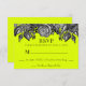 Ces cartes RSVP faire-part de mariage faciles à personnaliser ont un style distinctif audacieux. Elles sont ornées d'une impressionnante illustration de style gravure antique de roses en noir et blanc, avec des lettres noires audacieuses, le tout dressé contre un arrière - plan de couleur vert citron. Besoin d'inclure des informations supplémentaires ou de modifier le texte de cette invitation ? Il vous suffit de sélectionner l'option "customiser" pour retravailler le texte en fonction de vos besoins.