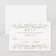 Des tourbillons décoratifs et des fleurs encadrent cette élégante carte de réponse mariage d'inspiration vintage. Couleurs blanches et or ancien. Personnalisez le texte RSVP personnalisé avec votre date d'échéance de réponse.