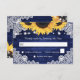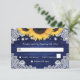Cartes RSVP personnalisées de mariage bleu marine avec tournesols sur un arrière - plan en bois de grange orné de dentelle blanche fleurie et de lampes à cordes. Deux coeurs de burlap à l'arrière. Un design de carte parfait pour compléter votre mariage rustique bleu marine inspiré des tournesols. Éléments correspondants disponibles pour cette carte RSVP entièrement personnalisable.