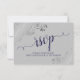 Ces belles cartes RSVP vous permettront de répondre facilement à vos faire-part de mariage. Elles présentent un design élégant avec des calligraphies de script bleu marine sur un arrière - plan gris, et des boucles et des tourbillons de faux feuillages gris lacy dans les coins. Le verso de la carte est un formulaire à remplir et à retourner, indiquant s'ils peuvent y assister ou non, le nombre d'invités qu'ils apportent et leur choix de repas. Il y a également de l'espace pour un site Web afin que vos invités puissent répondre en ligne si cela leur convient mieux.