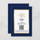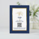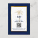 Offrez à vos invités de répondre à votre faire-part de mariage et d'explorer votre site mariage avec ces élégants détails RSVP et code QR design avec script moderne, bleu marine et or y compris un palmier artistique et cadre or métallique sur le devant de la carte. Un arrière - plan bleu marine est à l'avant et à l'arrière.