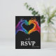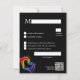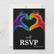 Voici la carte RSVP de la collection vibrante "Cœur de Fierté", qui présente une œuvre d'art époustouflante de la collection sur le devant. La légende sur le devant indique "Merci de répondre" ainsi que la date de réponse, invitant les invités à confirmer leur présence avec élégance et fierté. Le design met en valeur l'œuvre d'art emblématique "Cœur de Fierté" - deux mains formant un geste de cœur dans des couleurs LGBT radieuses - sur un fond noir profond, faisant une déclaration audacieuse et significative.