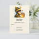 Carte RSVP avec une image mignonne. Une fille en costume d'abeille au crochet avec une abeille à ses côtés. Je regarde un pot de miel.