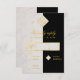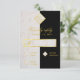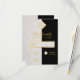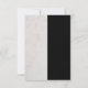 La carte est divisée en deux verticalement : une partie en marbre blanc et une carte noire. Un monogramme calligraphique dans des cadres carrés en faux or les unit (il a 2 initiales et un arrière - plan en marbre blanc). Il y a aussi des cadres en faux or pour les champs à compléter. Le texte est doré, le monogramme, le titre "Kindly Reply" et le M initial étant écrit avec un script calligraphique doré.