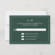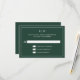 Carte RSVP mariage simple avec un design moderne et élégant avec votre monogramme à deux lettres en haut et vos détails entourés d'une mince bordure. Tout le texte est en blanc sur un arrière - plan vert de forêt. Les polices et les couleurs arrière - plans peuvent être changées en n'importe quelle couleur en cliquant sur le bouton "personnaliser". Un design chic et design qui conviendra à un couple minimaliste.