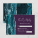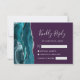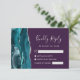 Le bord gauche de cette élégante carte de réponse de mariage moderne comporte une bordure d'agate aquarelle bleu sarcelle ornée de faux strass argentés. Le titre "Veuillez répondre" apparaît dans un script manuscrit, avec un texte personnalisable ci-dessous dans une police de caractères en cuivre gris argent sur fond violet. Le verso présente un design assorti d'agate sarcelle bleue et argent.