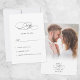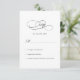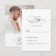 Notre carte de réponse à la calligraphie noire et blanche élégante présente un design intemporel. Sur fond blanc, les polices et les éléments noirs créent un look sophistiqué. Le verso présente un modèle de photo personnalisable avec un effet de bord fondu romantique, ainsi que les noms des mariés et la date du mariage dans une calligraphie assortie – parfaitement coordonnés avec nos invitations de mariage. Cette simple carte de réponse de mariage à la calligraphie minimaliste associe la tendance au style. Personnalisez-la avec vos informations de réponse pour refléter vos préférences uniques. Élevez votre papeterie de mariage avec ce design moderne, en veillant à ce que chaque détail soit mémorable.