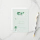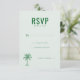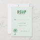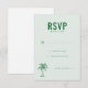 Cette carte de réponse de mariage présente un design minimaliste et élégant avec un fond vert menthe clair, créant une atmosphère calme et invitante. La mise en page est propre et équilibrée, avec un texte "RSVP" en majuscules gras en haut et des champs personnalisables pour une touche personnelle. Une simple illustration de palmier ajoute une touche de charme tropical, tandis que la typographie sans-serif assure la lisibilité et une sensation moderne. Parfaite pour les couples cherchant un look sophistiqué mais accessible pour leurs invitations d'événement.