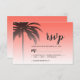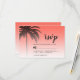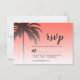 Carte RSVP de mariage de destination chic avec un design de palmier tropical sur un arrière - plan de corail clair avec un script élégant et une typographie moderne. Le corail s'évanouit sur un arrière - plan blanc. Ajoutez simplement les détails de votre mariage à cette carte de réponse de mariage tropical élégante. Conçu exclusivement pour vous par Happy Dolphin studio.