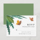 Cette élégante carte de réponse de mariage présente des papillons jaunes et orange (mariée et marié) volant autour de feuillage vert illustré à l'aquarelle. Le choix idéal pour les mariages de printemps et d'été. Personnalisez vos informations de réponse dans un mélange de polices de caractères traditionnelles et de calligraphie moderne. Le dos de la carte est vert clair.