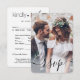 Partagez une de vos photos de fiançailles ou de mariage avec ces cartes RSVP élégantes et polyvalentes. Image et tout le texte sont simples à customiser. (CONSEIL EN MATIÈRE DE PLACEMENT D'IMAGE : Une façon simple de centrer une photo exactement comment vous voulez est de la rogner avant de la télécharger sur le site Zazzle.) La carte comprend les choix de repas, les allergies alimentaires, la demande de chant et l'option de répondre en ligne par l'intermédiaire d'un site Web ou d'une adresse électronique. Toutes les informations de réponse peuvent être personnalisées ou supprimées. Le design noir et blanc présente une typographie minimaliste moderne et une calligraphie manuscrite "rsvp" superposée avec 1 photo de votre choix. Cette carte est une façon élégante de demander aux invités mariages de répondre gentiment à votre prochaine célébration de la journée spéciale.