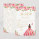 This elegant and glamorous sweet sixteen rsvp card features a beautiful princess with brunette hair and fair skin in a pink ball gown. The text combines handwritten script and modern sans serif fonts for a classy and sophisticated look. The floral arrangements, butterflies and gold confetti create the perfect blend of rustic and chic.