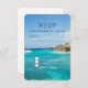 Carte RSVP avec une belle photo représentant un complexe balnéaire tropical. Jolie plage de sable blanc et d'eau bleue avec des paillotes, ce qui lui donne une ambiance insulaire tranquille.