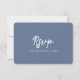 Carte rsvp de mariage de style classique avec un design simple et une touche moderne. "Rsvp" est dans un élégant script de brosse et la forme alterne entre une police sans serif et une police serif traditionnelle. La couleur est bleu poussiéreux et peut être changée en n'importe quelle couleur que vous souhaitez dans l'outil d'édition de conception. La disposition minimale de cette carte de réponse en fait une suite de faire-part de mariage formalisée idéale.