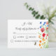 Faites de votre mariage une planification plus facile et plus belle avec nos pavots Fleurs sauvages Watercolor et nos cartes RSVP Cornflowers. Avec un mélange étonnant de chardons et de fleurs de maïs dans des teintes d'aquarelle douce, ces cartes de réponse ajoutent une touche florale unique à votre papeterie mariage. Parfaites pour les couples à la recherche d'un thème d'inspiration nature, boho ou rustique, ces cartes RSVP permettront à vos invités de répondre avec style. Le design élégant, avec ses fleurs sauvages délicats, se marie parfaitement avec n'importe quel faire-part de mariage, et la disposition personnalisable vous permet d'ajouter les détails de votre événement et de demander des réponses de vos invités. Que vous soyez l'hôte d'un rassemblement intime ou d'une grande fête, ces cartes RSVP florales sont une façon charmante de suivre votre liste d'invités tout en ajoutant une touche personnelle à votre correspondance mariage. Conçues avec soin et conçues pour répondre à votre esthétique mariage, ces pavots à l'aquarelle et cartes RSVP de fleurs de corne sont le complément parfait à votre papeterie mariage florale. Rendez votre journée spéciale encore plus mémorable en envoyant ces belles cartes de réponse personnalisées à vos invités.