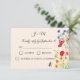 Faites de votre mariage une planification plus facile et plus belle avec nos pavots Fleurs sauvages Watercolor et nos cartes RSVP Cornflowers. Avec un mélange étonnant de chardons et de fleurs de maïs dans des teintes d'aquarelle douce, ces cartes de réponse ajoutent une touche florale unique à votre papeterie mariage. Parfaites pour les couples à la recherche d'un thème d'inspiration nature, boho ou rustique, ces cartes RSVP permettront à vos invités de répondre avec style. Le design élégant, avec ses fleurs sauvages délicats, se marie parfaitement avec n'importe quel faire-part de mariage, et la disposition personnalisable vous permet d'ajouter les détails de votre événement et de demander des réponses de vos invités. Que vous soyez l'hôte d'un rassemblement intime ou d'une grande fête, ces cartes RSVP florales sont une façon charmante de suivre votre liste d'invités tout en ajoutant une touche personnelle à votre correspondance mariage. Conçues avec soin et conçues pour répondre à votre esthétique mariage, ces pavots à l'aquarelle et cartes RSVP de fleurs de corne sont le complément parfait à votre papeterie mariage florale. Rendez votre journée spéciale encore plus mémorable en envoyant ces belles cartes de réponse personnalisées à vos invités.