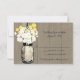 Carte de réponse -- Parfaite pour un mariage de style champêtre ou peut-être que vous aimez simplement les pots Mason ! Pot Mason suspendu à un crochet rempli de fleurs sauvages champêtres. Fond en panneau de bois ancien de couleur taupe foncé (X07531) avec un pot Mason suspendu contenant des boules jaunes et des marguerites blanches sauvages. Si vous avez des questions sur ce design ou si vous souhaitez une modification de couleur, veuillez m'envoyer un e-mail à paula@labellarue.com. Consultez également les cartes d'INVITATION PRINCIPALE, de RÉCEPTION et de PLACEMENT DES INVITÉS pour assortir !