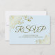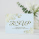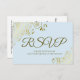 Ces belles cartes RSVP vous permettront de répondre facilement à vos faire-part de mariage. Elles présentent un design simple mais élégant avec des lettres en or sur un arrière - plan bleu poudreuse pâle, des boucles et des tourbillons floraux dorés en dentelle dans les coins. Le verso de la carte est un formulaire à remplir et à retourner, indiquant s'ils peuvent y assister ou non, le nombre d'invités qu'ils apportent et leur choix de repas. Il y a également de l'espace pour un site Web afin que vos invités puissent répondre en ligne si cela leur convient mieux.