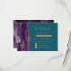 Le bord gauche de cette élégante carte d'enceinte RSVP de mariage moderne comporte une bordure d'aquarelle violette ornée d'une parties scintillant en faux or. Le titre "Kindly Reply" apparaît dans un script d'écriture manuscrite de couleur or, avec le texte restant dans les polices de caractères copperplate et italique sur un arrière - plan bleu turquoise. Inclut des espaces pour que vos invités puissent commencer leur choix de trois entrées modifiables. L'envers est assorti d'une agate violette et dorée.