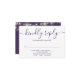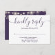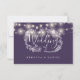 Une carte RSVP élégante avec vos détails en typographie chic et personnalisée avec vos noms, feuillage floral dessiné à la main, et des lampes à cordes sur un arrière - plan violet au verso. Conçu par Thisisnotme©