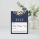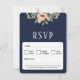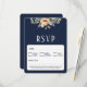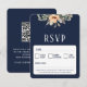 Carte de réponse RSVP de mariage bleu foncé avec fleurs d'abricot aquarelle et feuillage de jardin. Un design botanique contemporain simple mais élégant, inspiré du style boho vintage. Inclut l'espace pour le code QR et l'adresse du site Web du mariage.