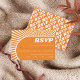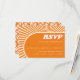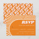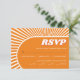 Cette carte de réponse RSVP pour un mariage a une ambiance rétro amusante avec son jeu de couleurs orange et blanc vif et les rayons solaires super. L'avant de la carte présente un design d'arc unique, ainsi que du texte personnalisé dans une police vintage et des rayons solaires. Sur le dos de la carte, l'acronyme RSVP est imprimé en orange et blanc formant un motif en diagonale.