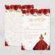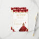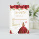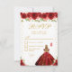 This elegant and glamorous sweet sixteen rsvp card features a beautiful princess with blonde hair and fair skin in a red ball gown. The text combines handwritten script and modern sans serif fonts for a classy and sophisticated look. The floral arrangements, butterflies and gold confetti create the perfect blend of rustic and chic.