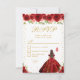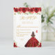 This elegant and glamorous sweet sixteen rsvp card features a beautiful princess with brunette hair and fair skin in a red ball gown. The text combines handwritten script and modern sans serif fonts for a classy and sophisticated look. The floral arrangements, butterflies and gold confetti create the perfect blend of rustic and chic.