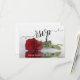 Cette carte RSVP présente un beau design avec une rose rouge allongée sur le côté à côté d'un bassin d'eau où l'on peut voir la fleur reflétée avec des rides et des vagues. Le titre est écrit en calligraphie à l'écriture ajourée. Le verso de la carte est conçu pour que vos invités remplissent soit en acceptant, soit en déclinant votre invitation et indiquent leur choix de repas. Il y a un espace pour entrer une adresse de page Web afin que vos invités puissent également répondre en ligne.