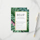 Une simple carte de réponse de mariage avec un fond peint représentant des feuilles tropicales peintes en vert. Un cadre blanc superposé avec une bordure en faux or.