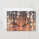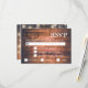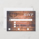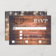 Carte RSVP de mariage rustique avec un arrière - plan en bois avec lampes à cordes. La date de RSVP par a une zone de texte marquée pour vous aider à la customiser pour votre journée.