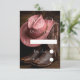 Une image magnifiquement composée qui capte l'essence d'un mariage campagnard, avec une paire de bottes brunes finement détaillées, jumelée à un casquette de cowboy douillet de couleur rose. Placé sur un fond en cuir robuste, mais aussi une texture en cuir sur le dos de la carte, le décor évoque le charme, la tradition et l’élégance occidentale, parfait pour la mariée ou le marié moderne qui apporte un petit air de pays à leur grand jour.