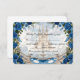 Transport your guests to a happily ever after. This enchanted design features a romantic castle illustration, perfect for a royal-themed luxury wedding.This design features a highly detailed digital illustration simulating a watercolor painting effect. The scene depicts a grand stone staircase leading up to a majestic storybook castle, flanked by a water fountain and two elegant white swans. The artwork is framed by deep navy blue roses and sage green foliage against a soft beige and dreamy blue cloud background. Text is rendered in a mix of traditional serif fonts and sweeping calligraphy.This is a flat printed image with a watercolor visual effect; it does not contain actual paint texture or raised foiling.