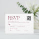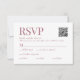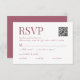 Elégante carte RSVP de mariage rose en bois de rose avec un code QR scannable pour le site Web et 3 choix de repas modifiables. L'exemple inclut des menus de viande, de poisson et de végétalien, mais peut être modifié en n'importe quel autre texte. Personnalisez-le avec votre propre texte.
