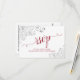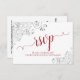 Ces belles cartes RSVP vous permettront de répondre facilement à vos faire-part de mariage. Elles présentent un design élégant avec une calligraphie en écriture rouge sur un arrière - plan blanc, et des boucles et des tourbillons floral gris argenté en dentelle dans les coins. Le verso de la carte est un formulaire à remplir et à retourner, indiquant s'ils peuvent y assister ou non, le nombre d'invités qu'ils apportent et leur choix de repas. Il y a également de l'espace pour un site Web afin que vos invités puissent répondre en ligne si cela leur convient mieux.