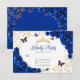 Royal blue gold floral Quinceanera RSVP reply card. Features, script font, gold butterflies, watercolor roses and tiara. Perfect for an elegant princess style glam celebration. Personalize with your own details.