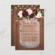Parfaites pour les mariages boho de campagne, ces cartes RSVP fleuries rustiques correspondent aux invitations de mariage, et présentent un bouquet de fleurs bordeaux et rousses sur un bocal de mason avec le texte important à l'intérieur. Des lampes à cordes décorent le dessus du design, avec un arrière - plan en bois rustique.
