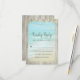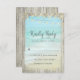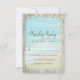 Incluez ces cartes RSVP dans votre Rustic Beach Wood Faire-part de mariage Suite. Une scène de plage avec des vagues bleues d'aqua qui s'écrasent contre le rivage au spray blanc, est encadrée de bois patiné rustique, et des lampes à cordes décorent le sommet.